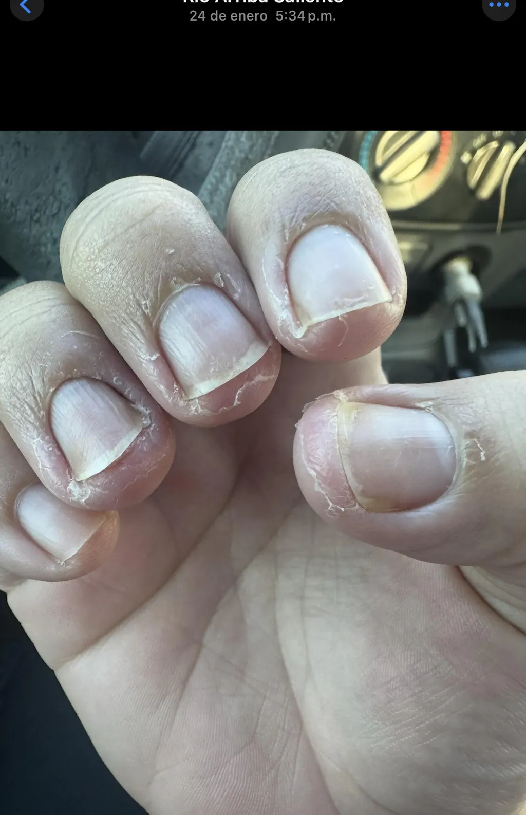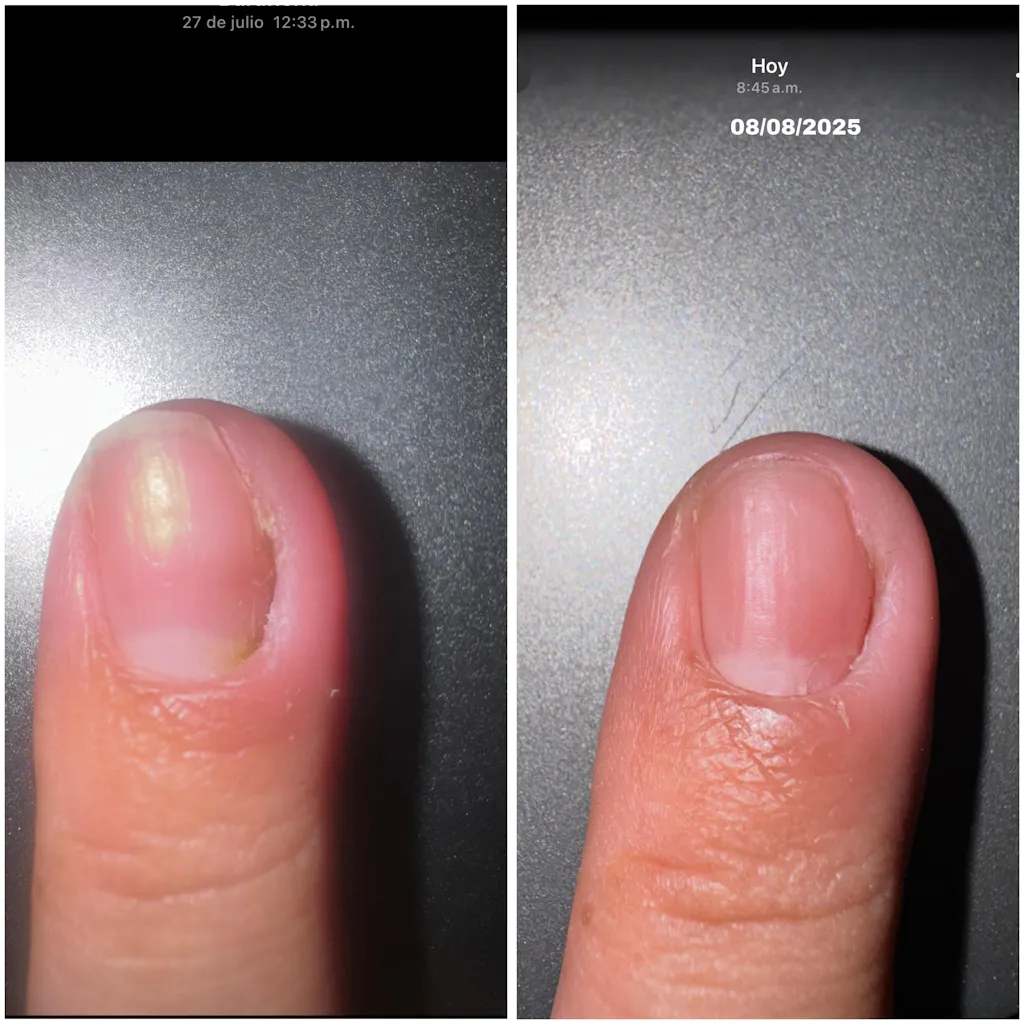 Por más de un año me estuve realizando manicura rusa sin pausar en ningún momento. En enero 2025 decido no realizarmelas por un tiempito y ahí comenzó mi calvario… mis dedos se comenzaron a despellejar, las uñas se veían huecas en algunas esquinas y hasta se tornaron amarillentas. Yo sentía una vergüenza enorme, pues ya las personas estaban impuestas a verme con uñas y siempre me pedían mostrárselas, pero cuando me pasó eso yo evitaba que me hablaran de las uñas y escondía mis manos. Gasté mucho dinero comprando cremas, líquidos de brochas anti fungal, nippers etc y nada me funcionaba. Ya hasta tenía cita con un médico para que me evaluara y me recetara medicamentos. (No llegué a ir). Entonces desde hace mucho tiempo sigo a DMPEDICURE por IG, pero hacía caso omiso porque pensaba que sus productos eran solo para pies y mi problema era en las manos. Hasta que di con ella por los Live de Tiktok y comencé a comentar mi situación y me habló de su aceite para hongos… sin esperanzas alguna dije, lo voy a pedir. Y WOWW!!!!!! El pedido me llegó el 24 de julio de 2025, pero no fue hasta el 27 de julio de 2025 que me animé a comenzar a utilizarlo y en tan solo una semana y cinco días he visto un cambio impresionante 😭❤️🩹🥰 EL ACEITE ES MILAGROSO. Seguiré pidiendo más !!! Miren las fotos adjuntas. Tienen sus fechas y todo, el testimonio es 100% REAL.